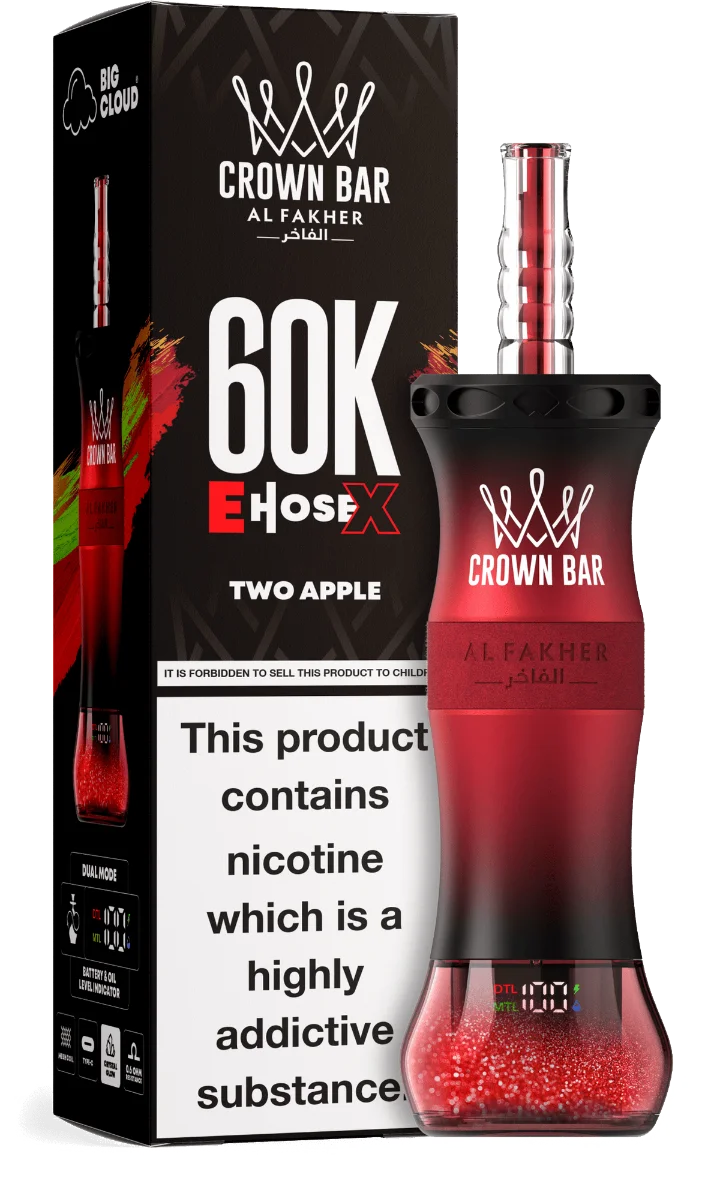 Al Fakher Crown Bar E Hose X 60000 Puffs Two Apple Disposable Vape represents the absolute pinnacle of high-capacity vaping devices, setting a new benchmark for longevity and shisha-inspired performance. Designed for enthusiasts who demand weeks, not days, of usage, this device boasts an incredible 60,000 puff capacity, powered by a robust rechargeable battery and a massive e-liquid reservoir. It is engineered to replicate the authentic, voluminous clouds of a traditional hookah session.With a massive 60,000 puff capacity, it promises longevity far beyond most disposable vapes on the market.