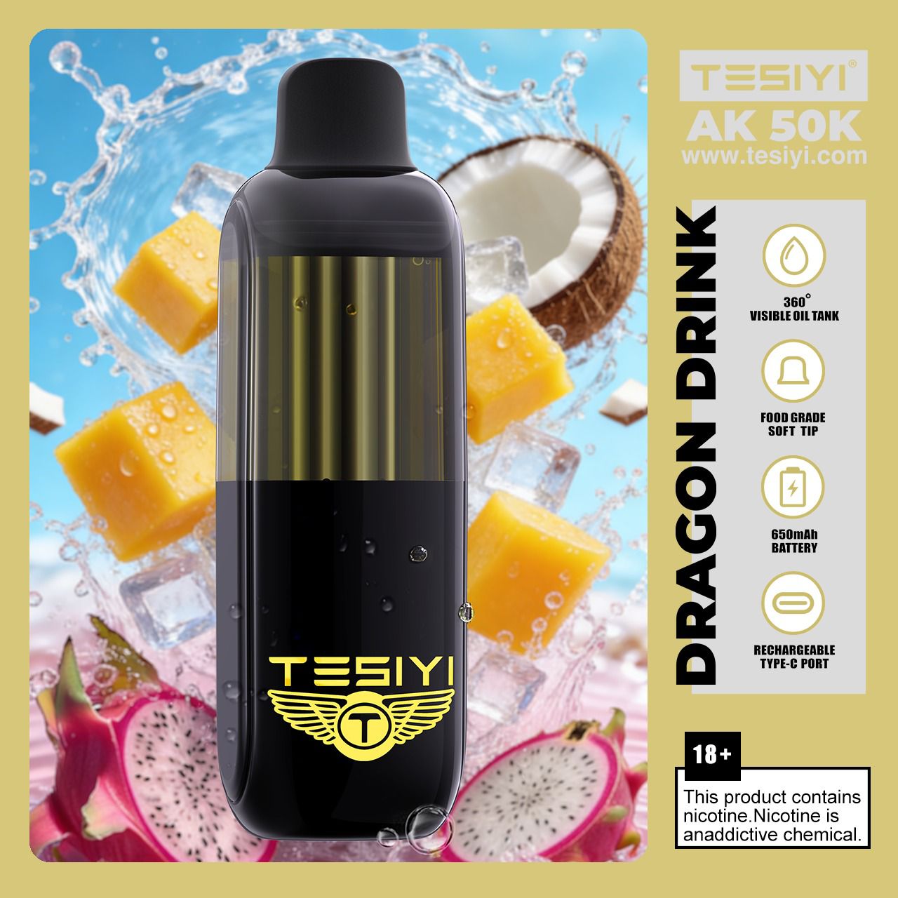 Built with modern vaping technology, the Tesiyi AK 50K combines a sleek, ergonomic design with advanced features such as rechargeable functionality, adjustable airflow, and high-capacity e-liquid storage. It is ideal for adult users looking for a reliable, long-lasting disposable device that delivers consistent flavor and smooth vapor production from the first puff to the last.
